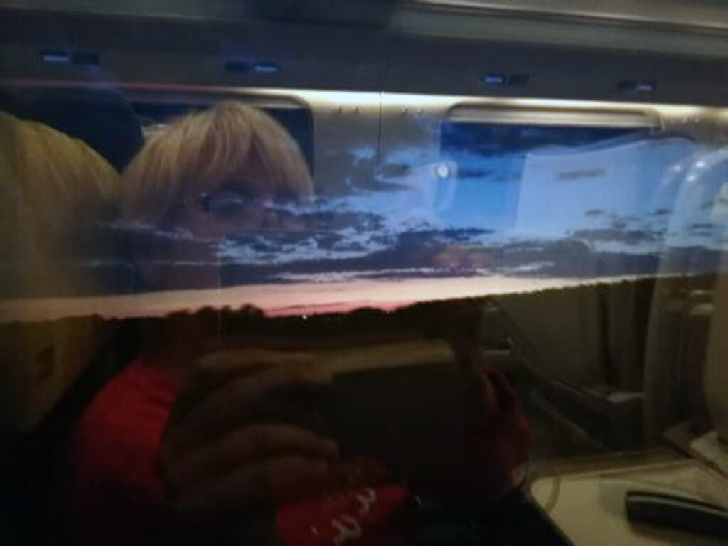 zdjęcie pokazujące osobę odbitą w szybie pociagu o zmierzchu.