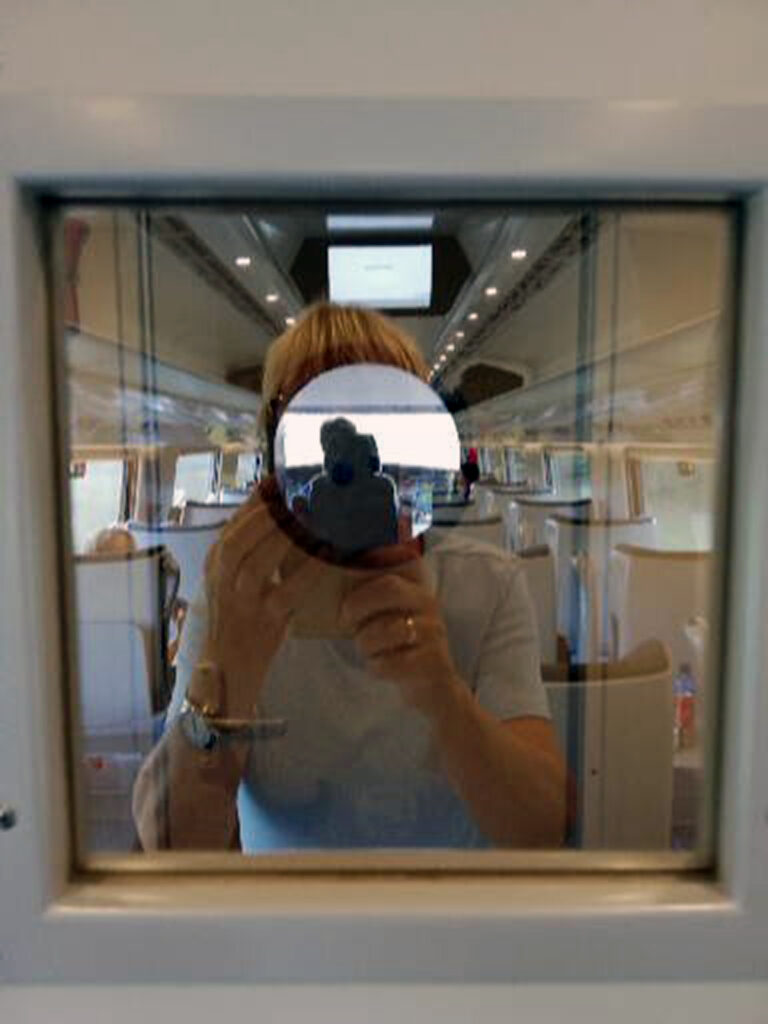 zdjęcie pokazujące osobę odbitą w szybie pociagu, pomiędzy przedziałami.